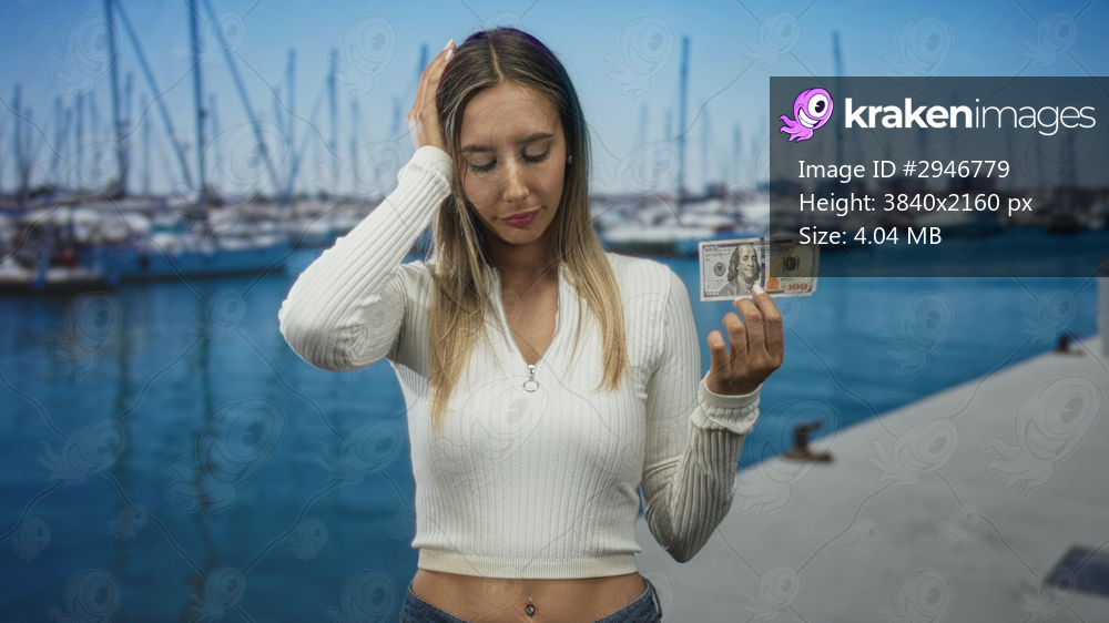 Woman holding a banknote with fingers and touching her head at a port pier; pensive financial doubt.
