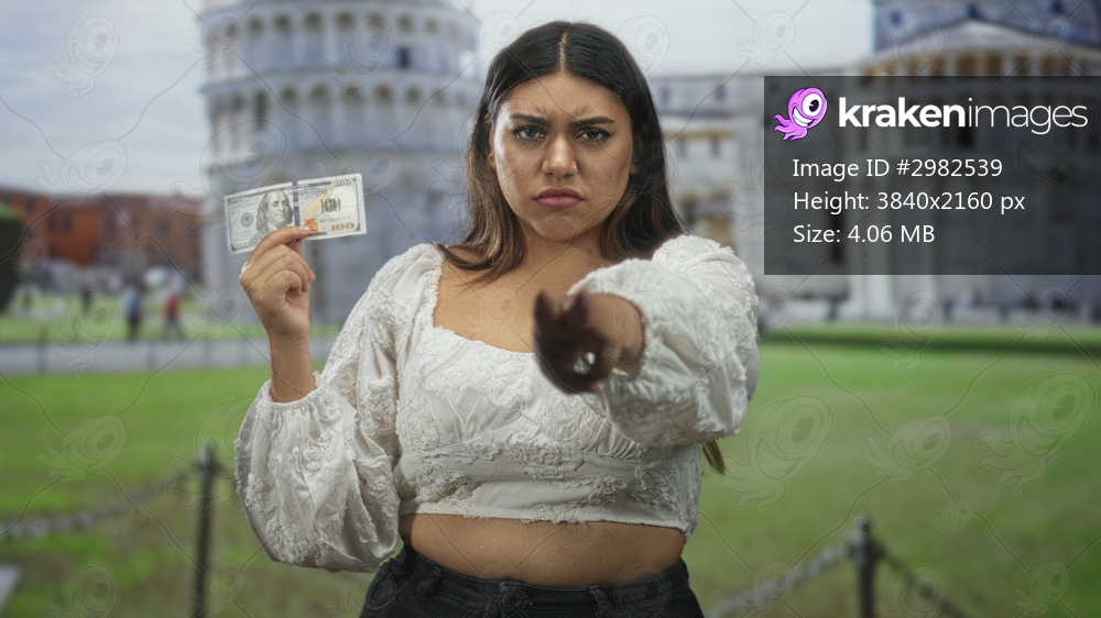 Woman holding a banknote and pointing finger toward a building landmark near a fenced lawn by the tower in italy; frustration demand.