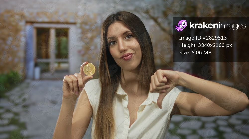 Woman holding a bitcoin coin and giving a thumbs down gesture at a house entrance; financial skepticism.