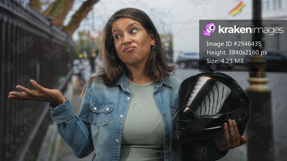 Woman holding a black motorcycle helmet and shrugging with one hand beside a lamppost and iron railing on a city street, wearing denim jacket and green top; uncertainty hesitation. - Kraken Images