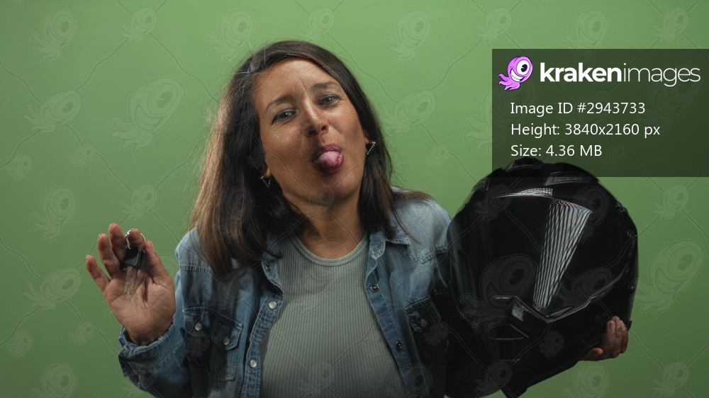 Woman holding a black motorcycle helmet and sticking out her tongue while smiling, denim jacket worn in studio; joyful attitude.