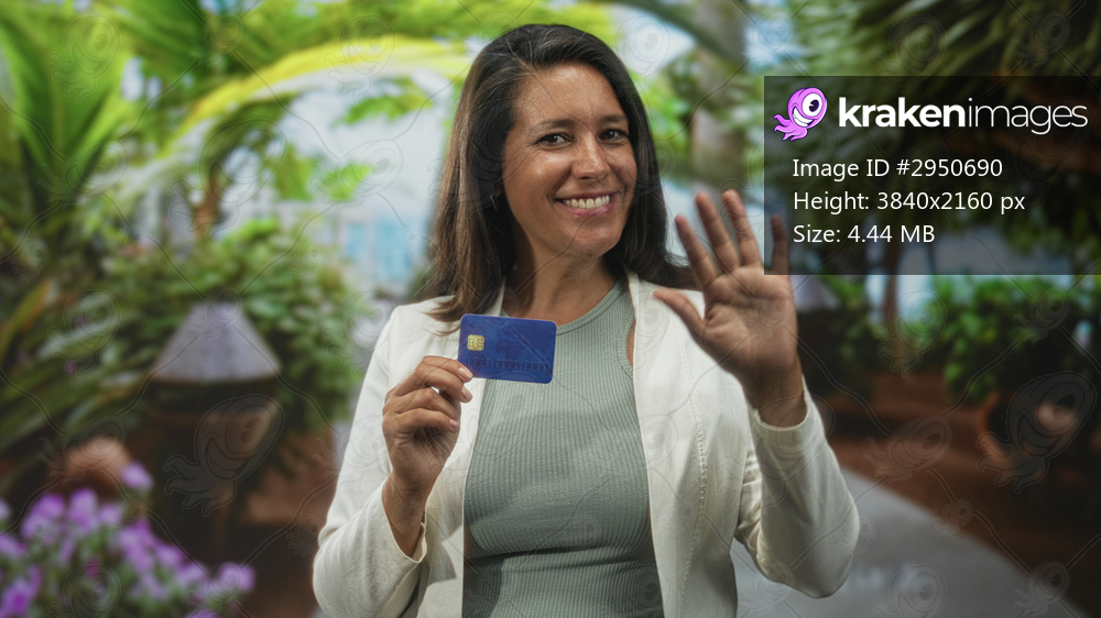 Woman holding a blue creditcard and waving hand in a studio tropical set with potted plants and path; confidence security.