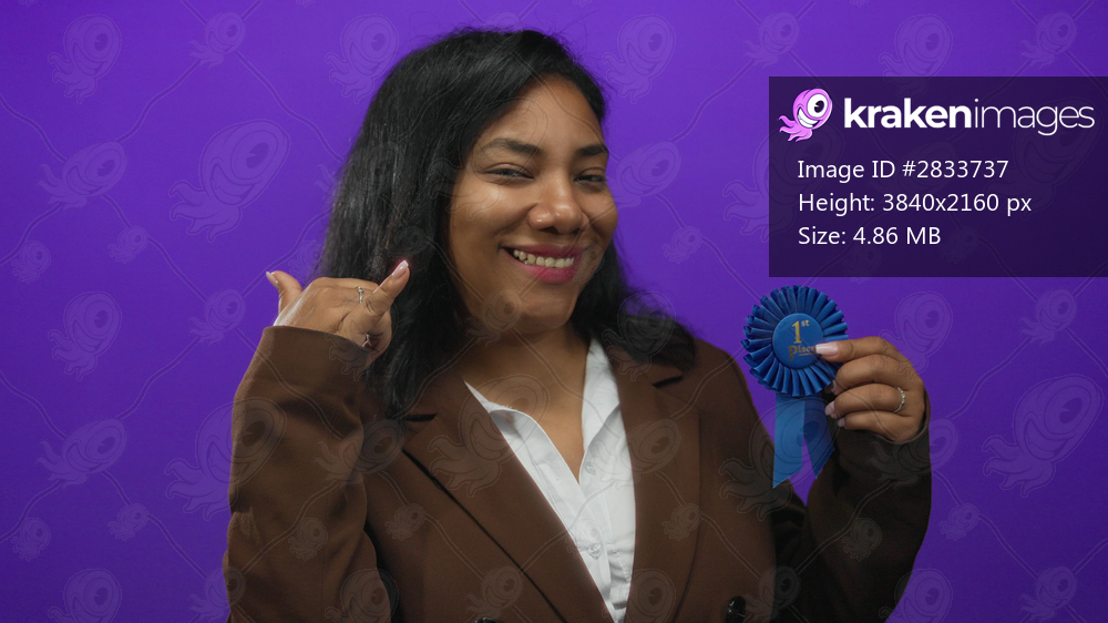 Woman holding a blue first place ribbon and making call me gesture in purple studio; confidence success celebration empowerment.