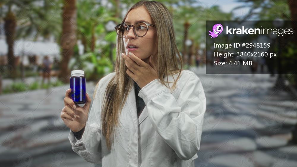 Woman holding a blue medicine bottle with hand to chin while wearing a white lab coat on a palm lined pedestrian street; health concern.