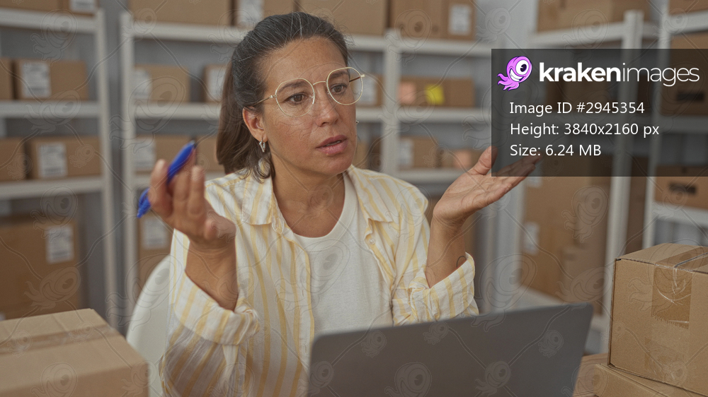 Woman holding a blue pen gestures toward a laptop and stacked cardboard boxes in a building storage area; small business concentration.