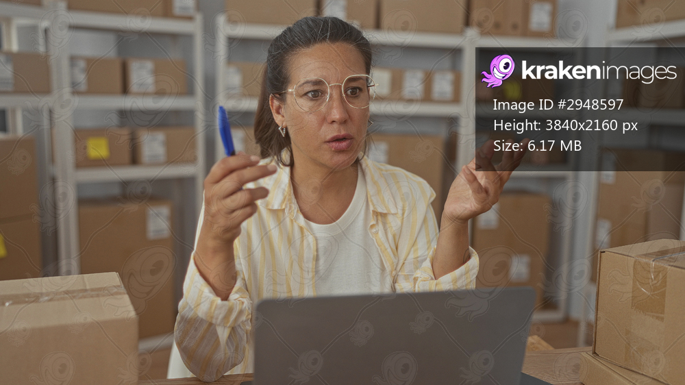Woman holding a blue pen gestures toward a laptop and stacked cardboard boxes in a building storage area; small business concentration.