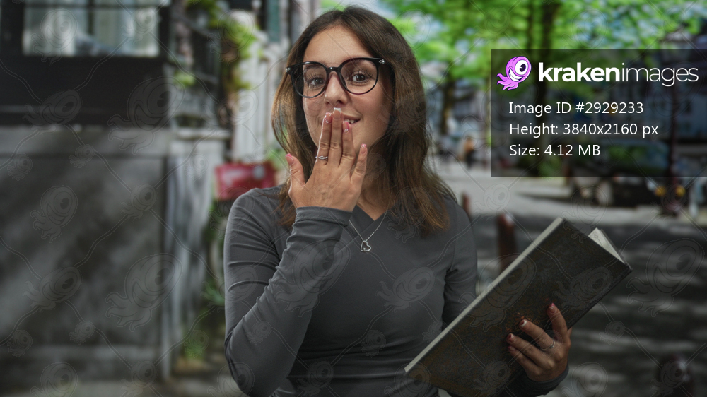 Woman holding a book and blowing a kiss on a busy city street, wearing glasses and heart necklace, trees and parked cars visible; playful curiosity.