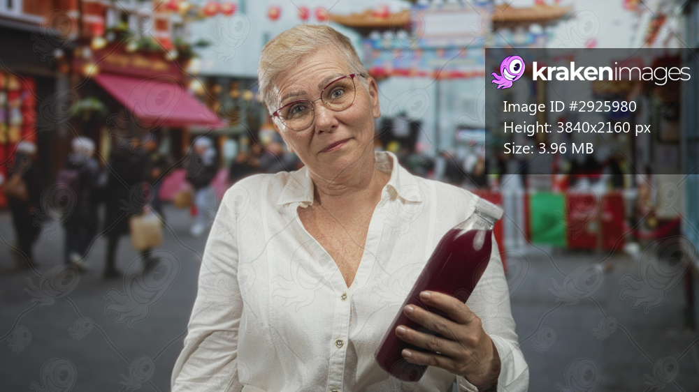 Woman holding a bottle with hand visible in a busy city street market, wearing glasses and white shirt; curiosity health.