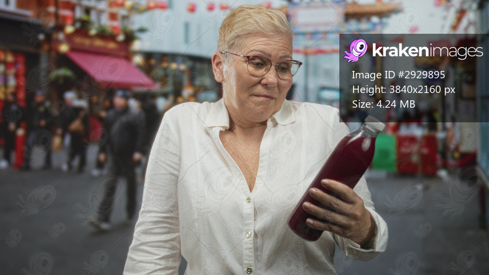 Woman holding a bottle with hand visible in a busy city street market, wearing glasses and white shirt; curiosity health.