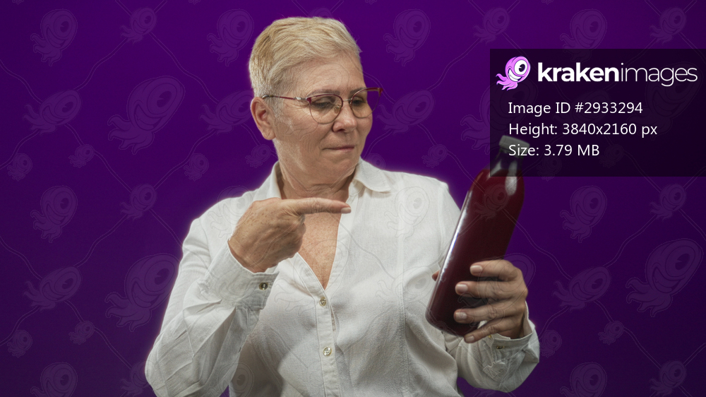 Woman holding a bottle and looking at the label in studio with purple backdrop; health curiosity contemplation.