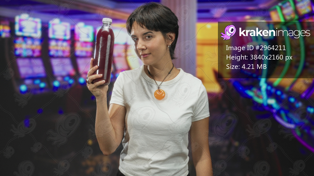 Woman holding a bottle of pomegranate juice with hand raised and short hair visible among slot machines in a building; confidence.