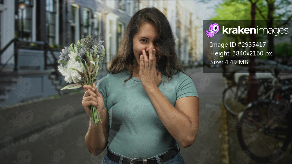 Woman holding a bouquet and covering her mouth with her hand on a street with bicycles and row houses; surprise gratitude.