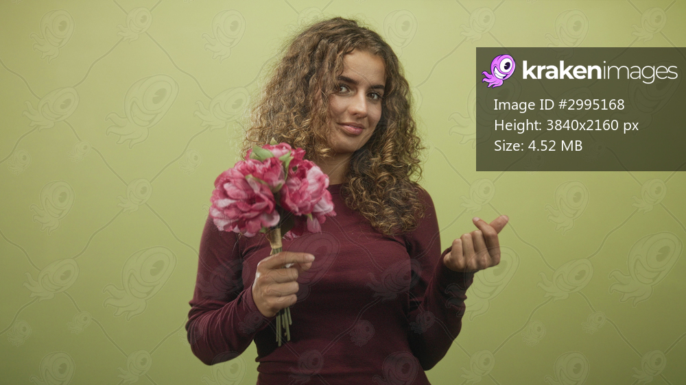 Woman holding a bouquet of pink flowers, fingers beckoning with a smirk, curly hair visible against a green studio wall; playful charm.