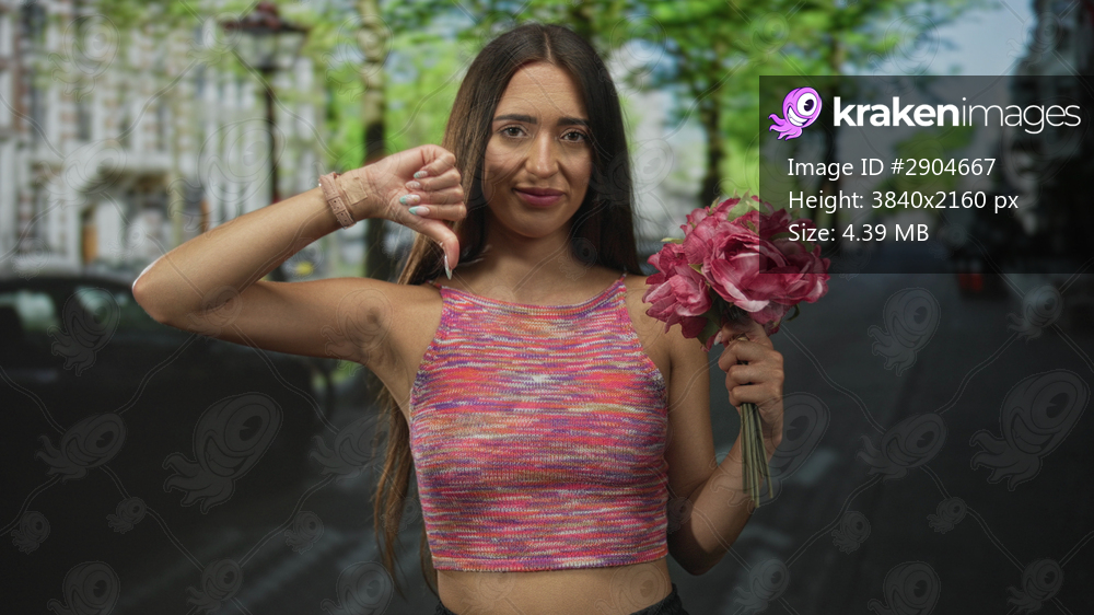 Woman holding a bouquet of pink flowers giving thumbs down gesture on a city street while wearing a colorful knit top and watch; rejection protest refusal dissent. - Kraken Images