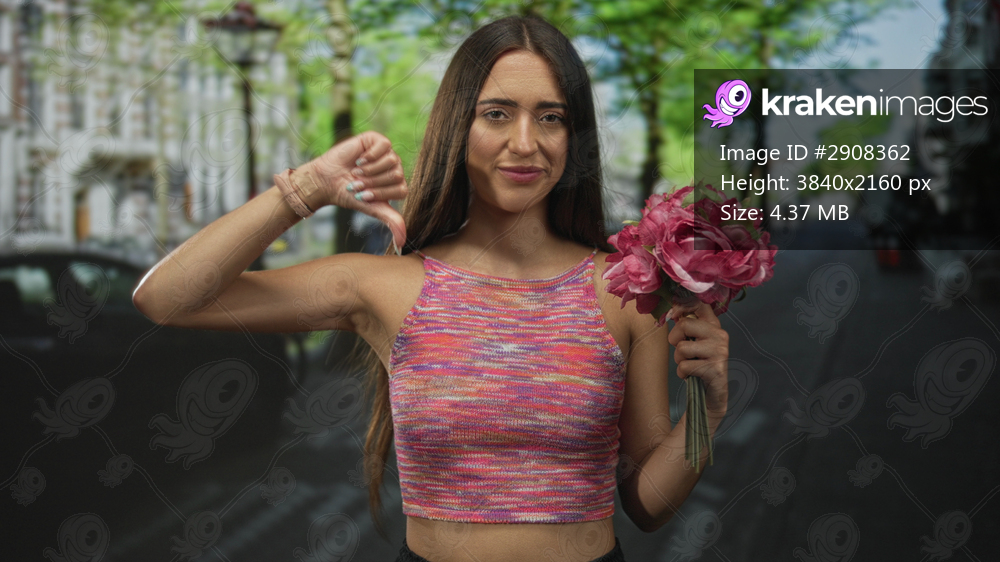 Woman holding a bouquet of pink flowers giving thumbs down gesture on a city street while wearing a colorful knit top and watch; rejection protest refusal dissent. - Kraken Images