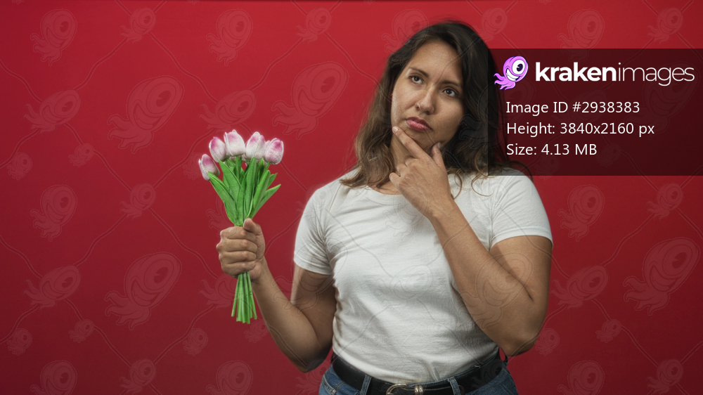 Woman holding a bouquet of pink tulips with chin on hand in red studio wearing white t shirt and jeans; pensive doubt.