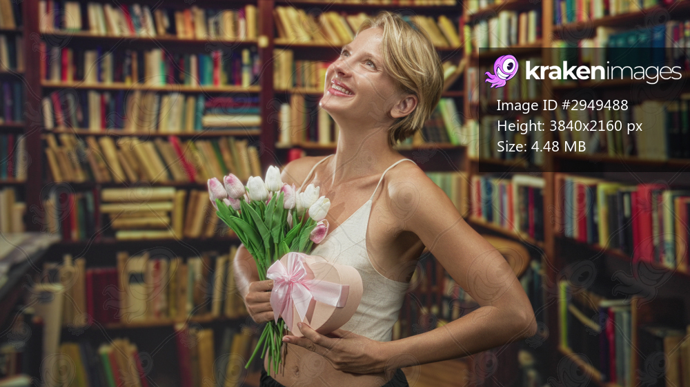 Woman holding a bouquet of tulips and a heart shaped gift box while smiling amid bookshelves in a library building; joyful love.