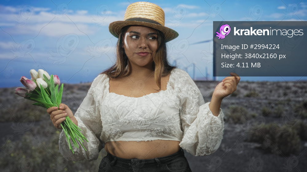 Woman holding a bouquet of tulips with hand on chin in wind farm wearing straw hat and white lace blouse, midriff visible; contemplation hope.