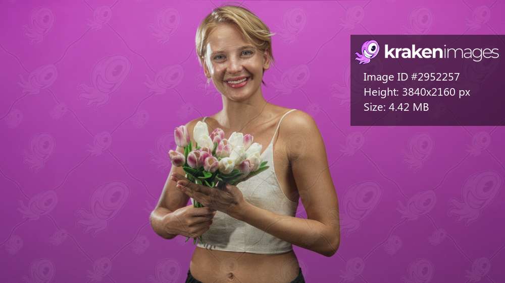 Woman holding a bouquet of tulips, hand presenting flowers in studio with purple backdrop and bright lighting; joyful gratitude.