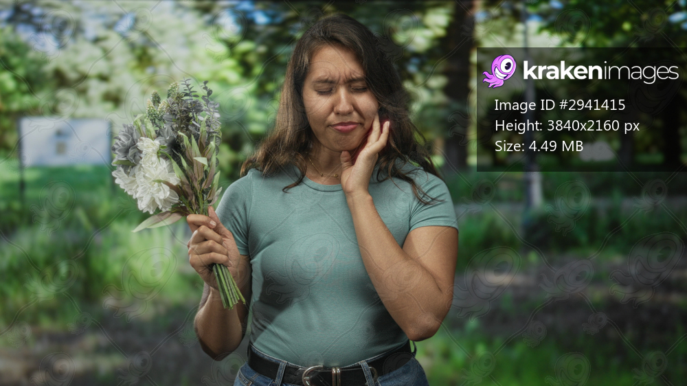 Woman holding a bouquet of white flowers, hand on cheek for toothache in forest park setting; discomfort.