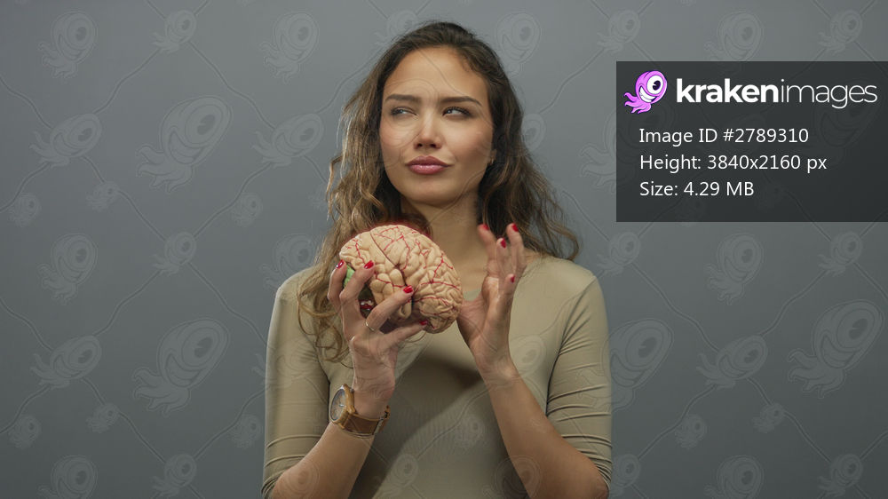 Woman holding a brain model, isolated on a grey background, displaying thoughtful facial expressions, showcasing education, learning, and scientific curiosity.