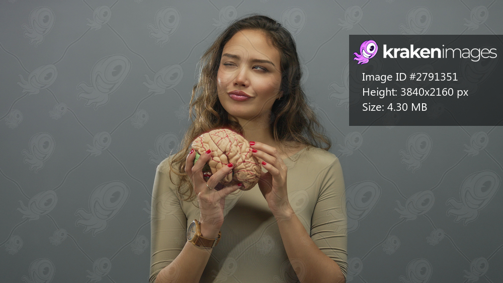 Woman holding a brain model, isolated on a grey background, displaying thoughtful facial expressions, showcasing education, learning, and scientific curiosity.