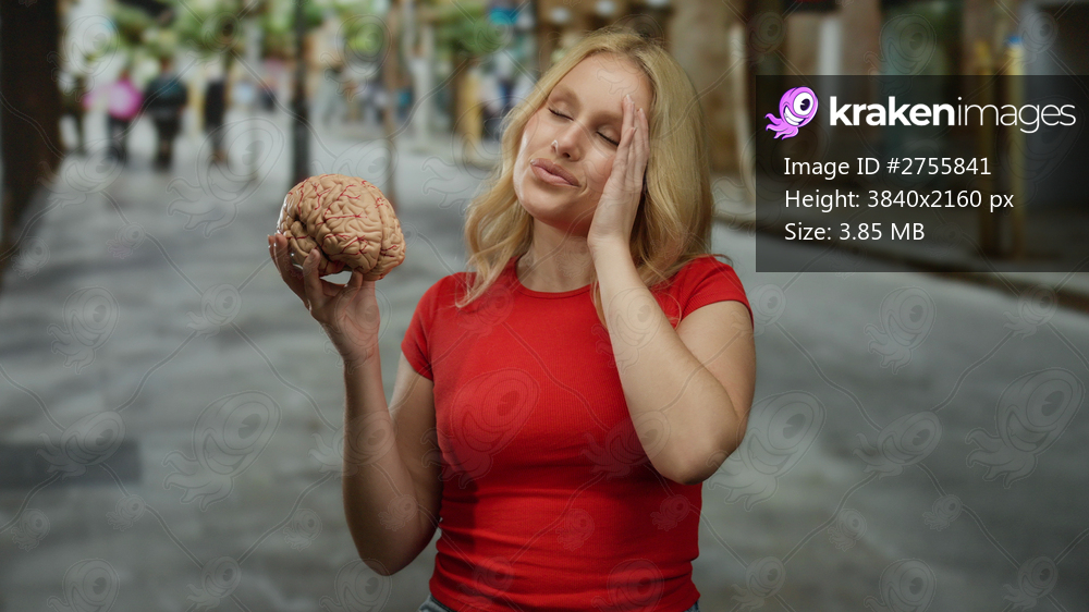 Woman holding a brain on a busy city street, wearing a red shirt with an expression of curiosity and amusement, surrounded by blurred urban scenery.