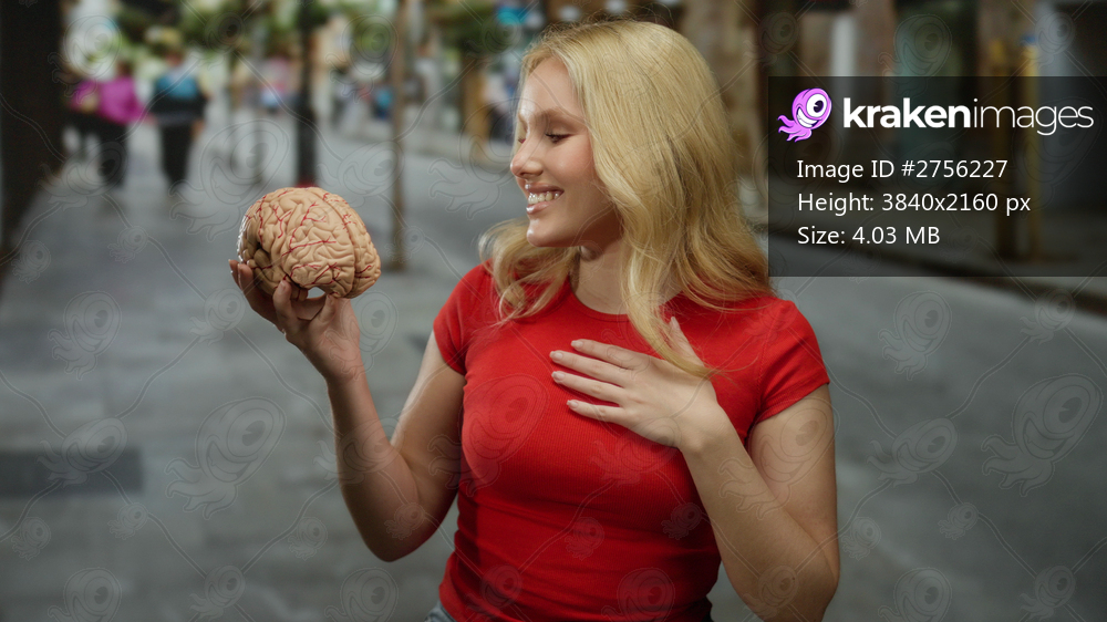 Woman holding a brain on a busy city street, wearing a red shirt with an expression of curiosity and amusement, surrounded by blurred urban scenery.