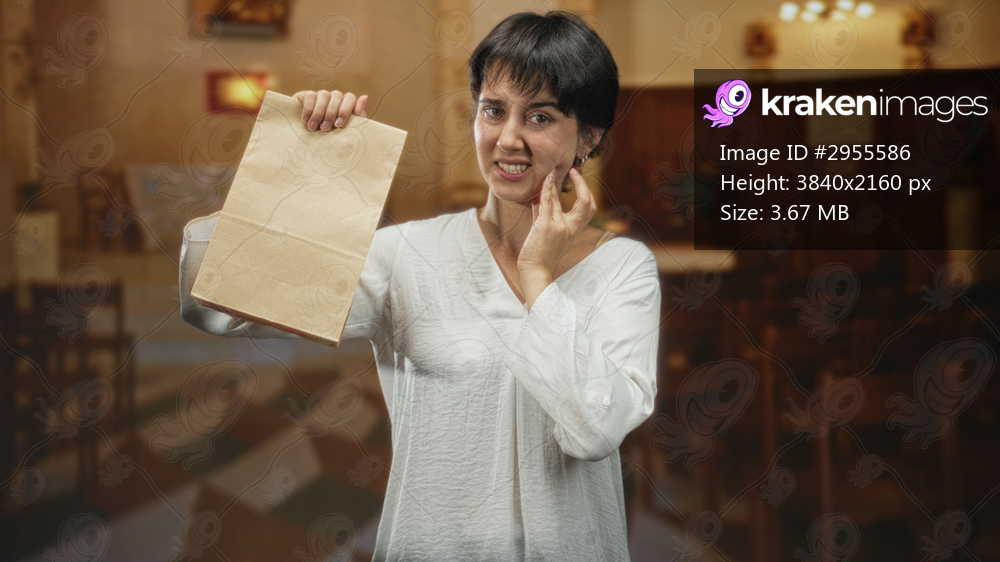 Woman holding a brown paper bag in one hand and touching her cheek with the other for toothache in a building with wooden chairs and an altar visible; unease. - Kraken Images