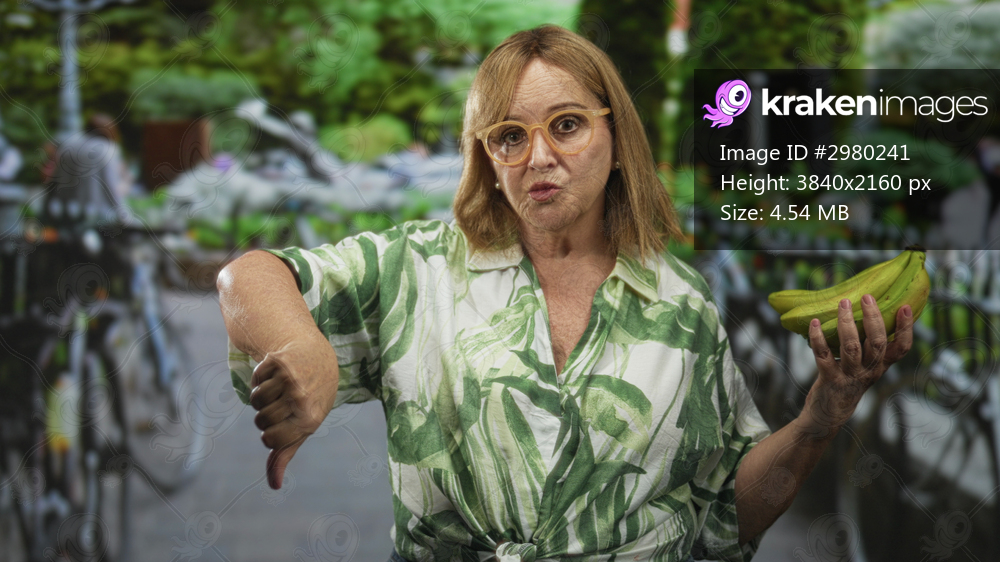 Woman holding a bunch of green bananas in one hand and making a thumbs down gesture with the other in street wearing tropical shirt; disapproval.