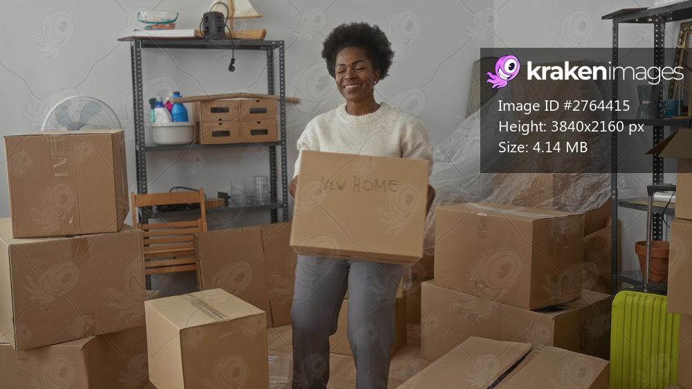 Woman holding a cardboard box labeled new home while unpacking in a living room surrounded by moving boxes, conveying a sense of new beginnings and relocation joy. - Kraken Images