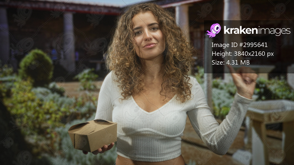 Woman holding a cardboard delivery box in one hand pointing thumb to side in a building courtyard; confidence sharing.