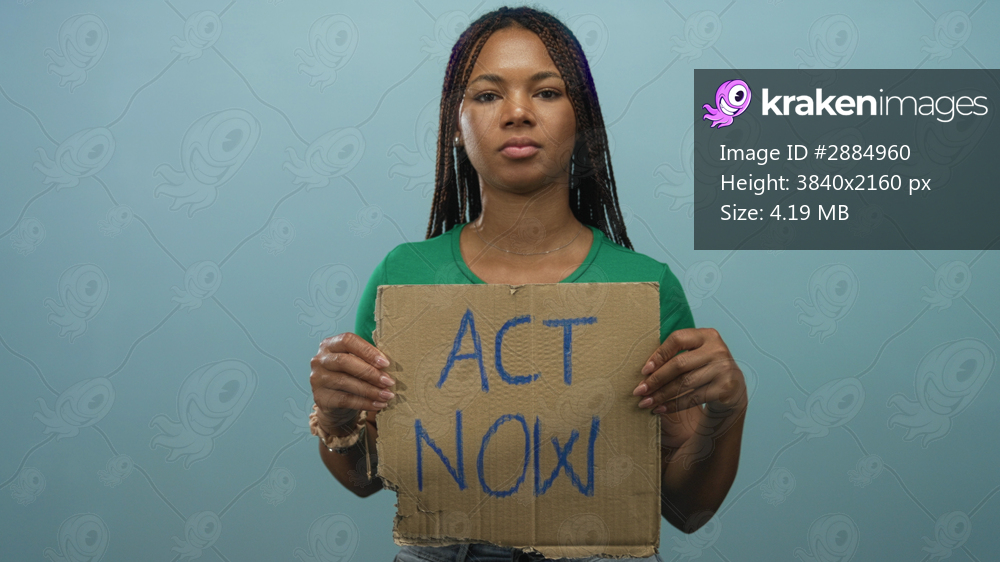 Woman holding a cardboard protest sign with hands visible and direct gaze in blue studio; climate justice urgent.