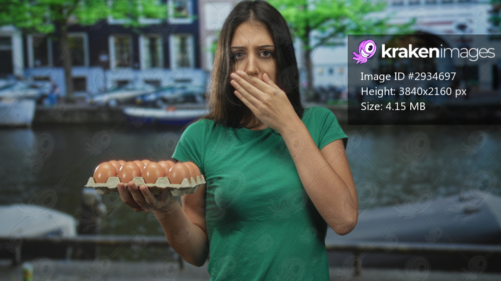 Woman holding a carton of eggs with outstretched hand and covering mouth with hand on street by a canal in amsterdam; disgust caution.