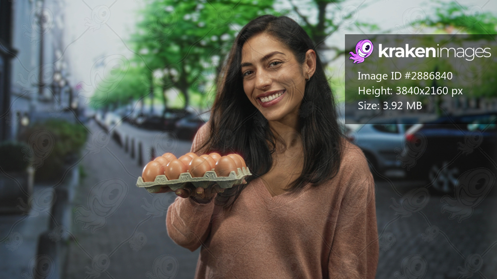 Woman holding a carton of eggs with outstretched hand offering breakfast on a city street with parked cars and green trees; sharing community cheerful. - Kraken Images