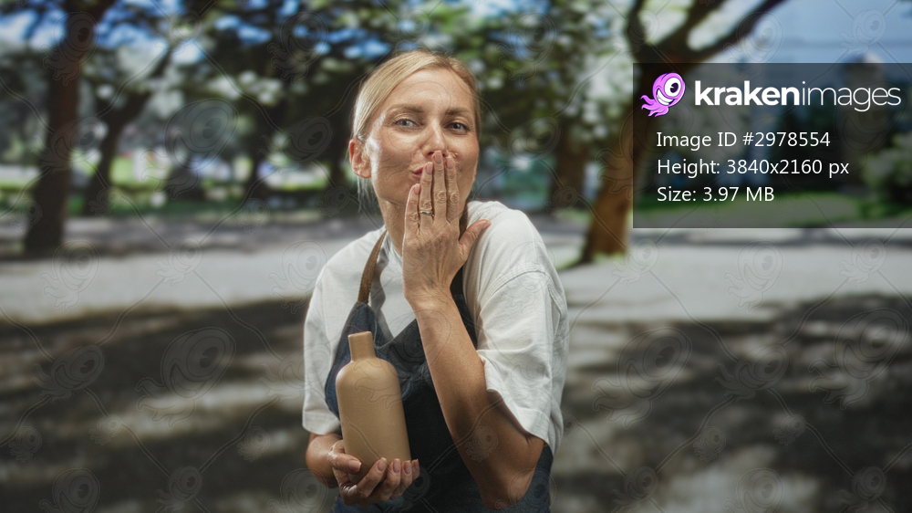 Woman holding a ceramic bottle with hands, smiling and blowing a kiss while wearing an apron on a street with trees and buildings; joy craft pride.
