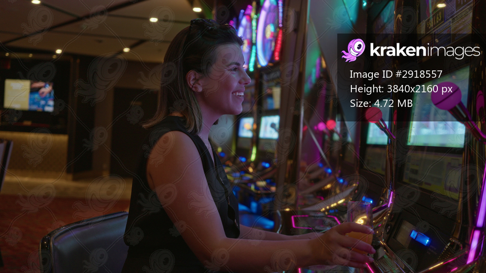 Woman holding a champagne glass drinking while playing slot machine in a casino building with neon lights; win joy.