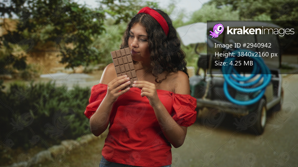 Woman holding a chocolate bar with red headband on a golfcourse path, gaze upward and thoughtful; contemplation indulgence.
