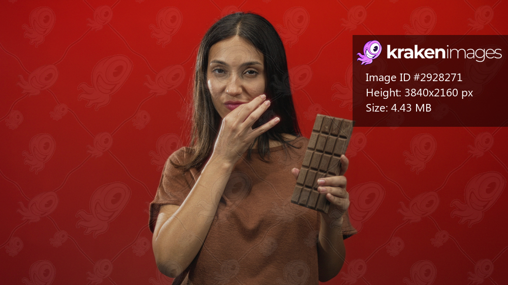 Woman holding a chocolate bar and touching her lips with fingers in a red studio while looking at camera; playful craving.