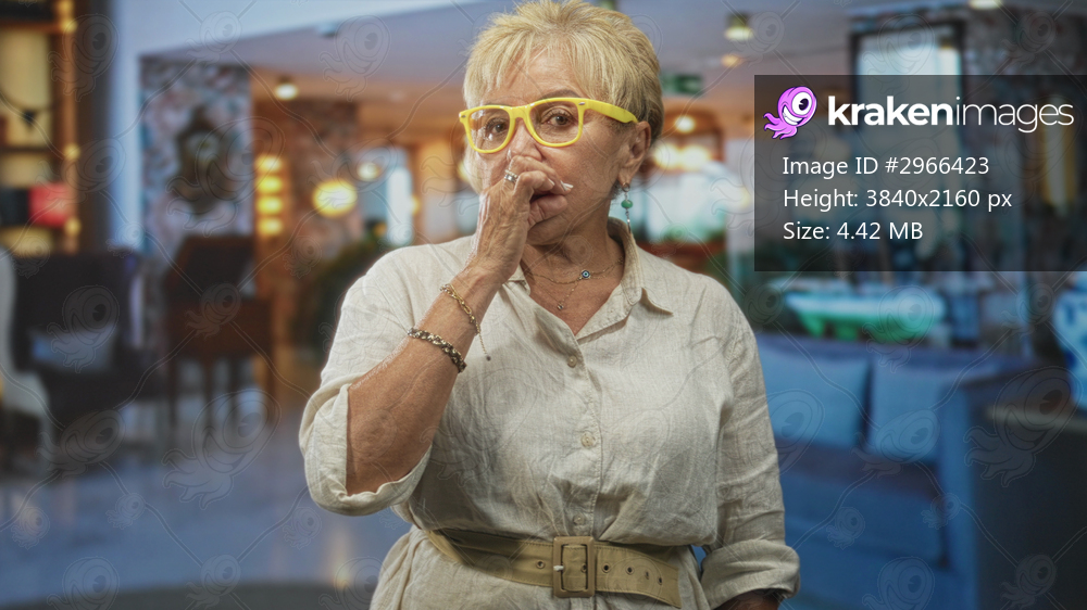 Woman holding a cigarette between fingers and pointing in a hotel lobby building, wearing yellow glasses and a beige blouse; quiet contemplation.