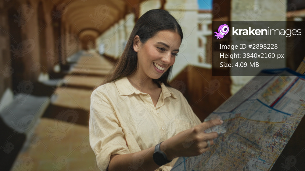 Woman holding a city map and pointing finger to route on street in old town building corridor; travel exploration.