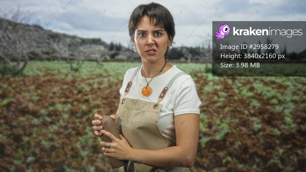 Woman holding a clay pottery jar with both hands in a farm field wearing an apron and scowling while gripping the vessel; frustration.