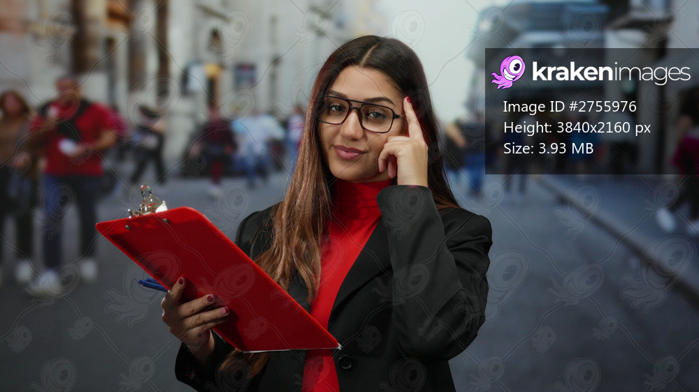 Woman holding a clipboard making a thinking gesture on a bustling street, wearing glasses and a red top, symbolizes decision-making and focus in an urban environment. - Kraken Images