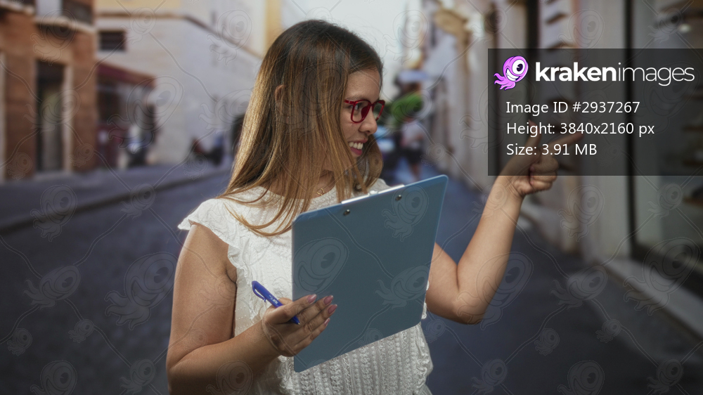 Woman holding a clipboard and points finger on a bustling city street while smiling, jotting notes with a pen on a notepad and wearing red glasses; friendly confidence. - Kraken Images