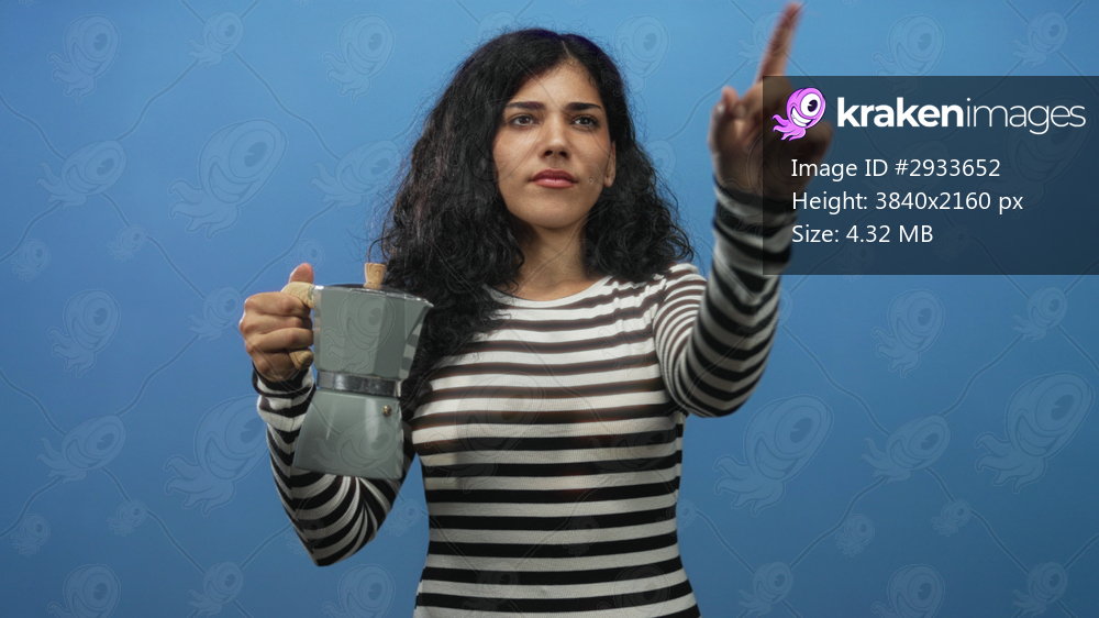 Woman holding a coffeemaker in left hand and pointing index finger with right hand in blue studio wearing black and white striped shirt; focused morning ritual. - Kraken Images