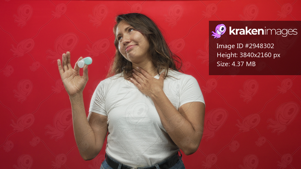 Woman holding a contact lens case between thumb and forefinger while pressing hand to chest in red studio, wearing white t shirt and jeans; disgust concern. - Kraken Images