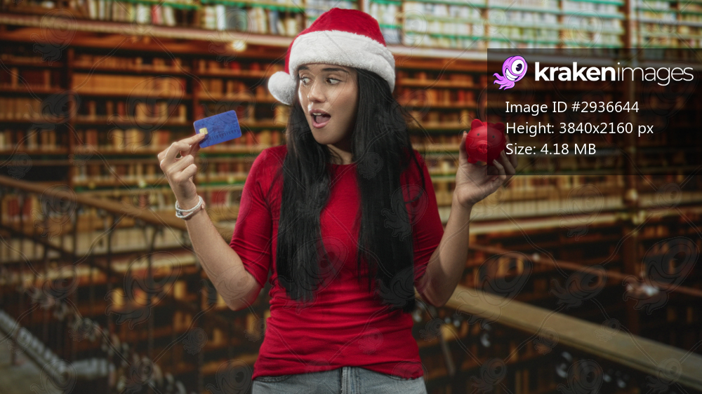 Woman holding a creditcard in one hand and a red piggybank in the other with a surprised expression in a building; holiday budgeting concern.