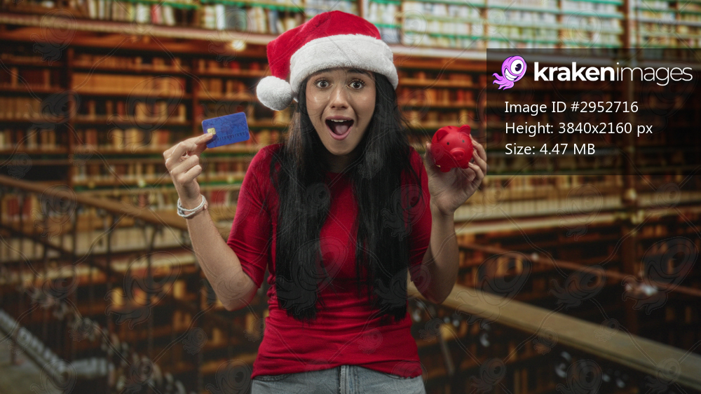 Woman holding a creditcard in one hand and a red piggybank in the other with a surprised expression in a building; holiday budgeting concern.
