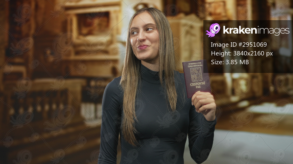 Woman holding a czech passport in a historic building interior, smiling and presenting the document; pride travel.