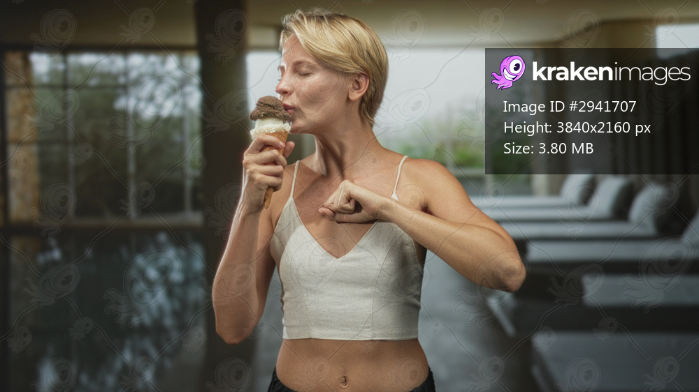 Woman holding a double scoop chocolate and vanilla ice cream cone in building, smiling with eyes closed and relaxed posture; summer joy.